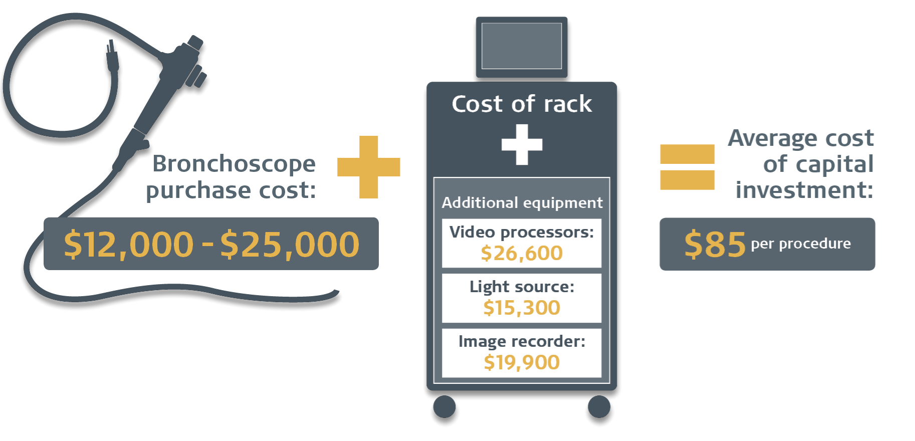 A aquisição de um broncoscópio reutilizável requer um investimento de capital significativo devido ao seu preço elevado, que varia desde 12.000 a 25.000 USD. Dependendo do tamanho do departamento e do número de procedimentos, é frequentemente necessário mais do que um broncoscópio reutilizável para dar resposta às necessidades clínicas.